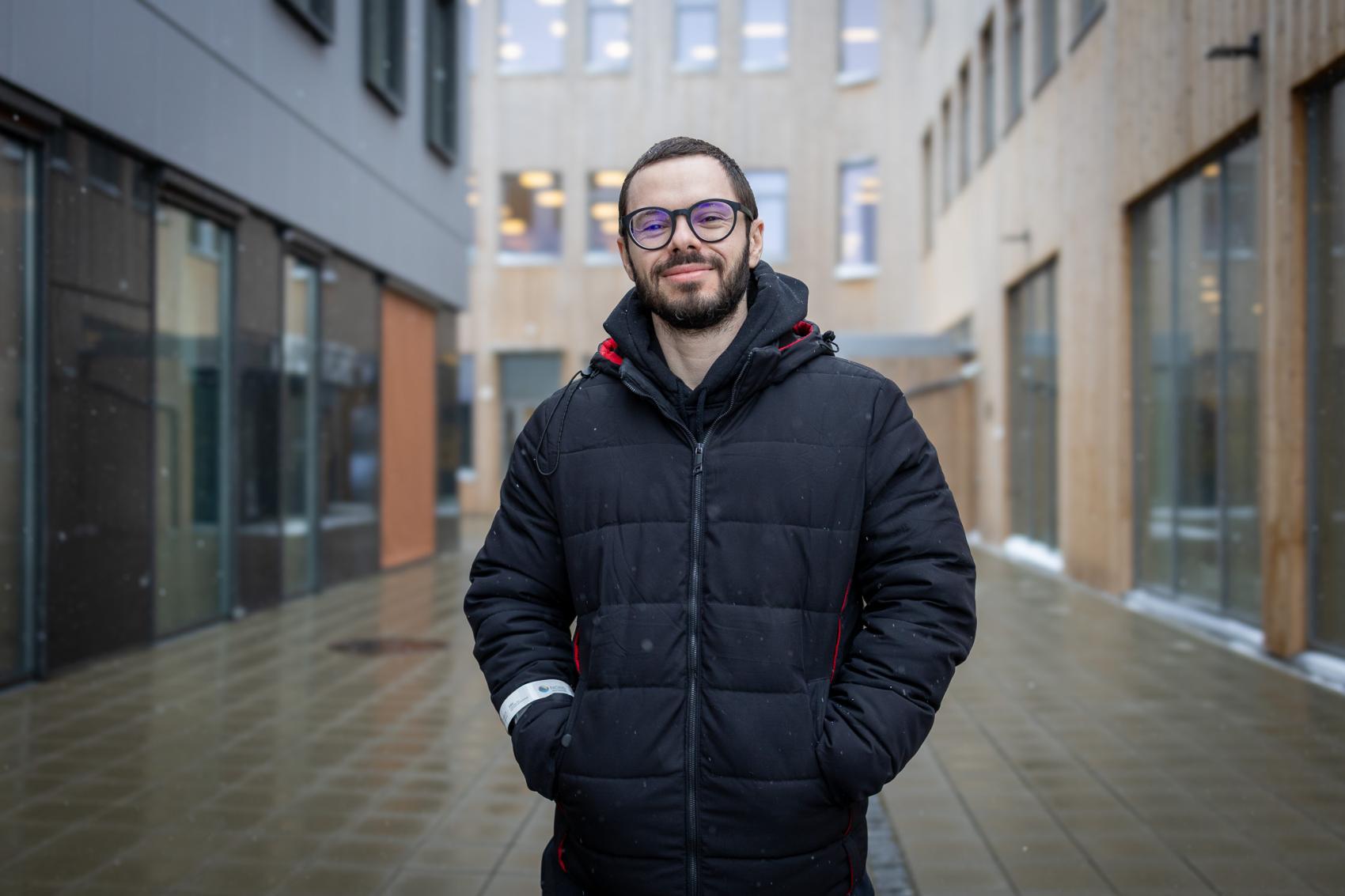 Karoline Lund Johansen and Renan de Jesus Ferreira share their experiences with the Sustainable Leadership and Arctic Perspectives master’s at Nord University - here standing outside Nord University in Bodø. Photo by Markus Johnsen Thonhaugen.